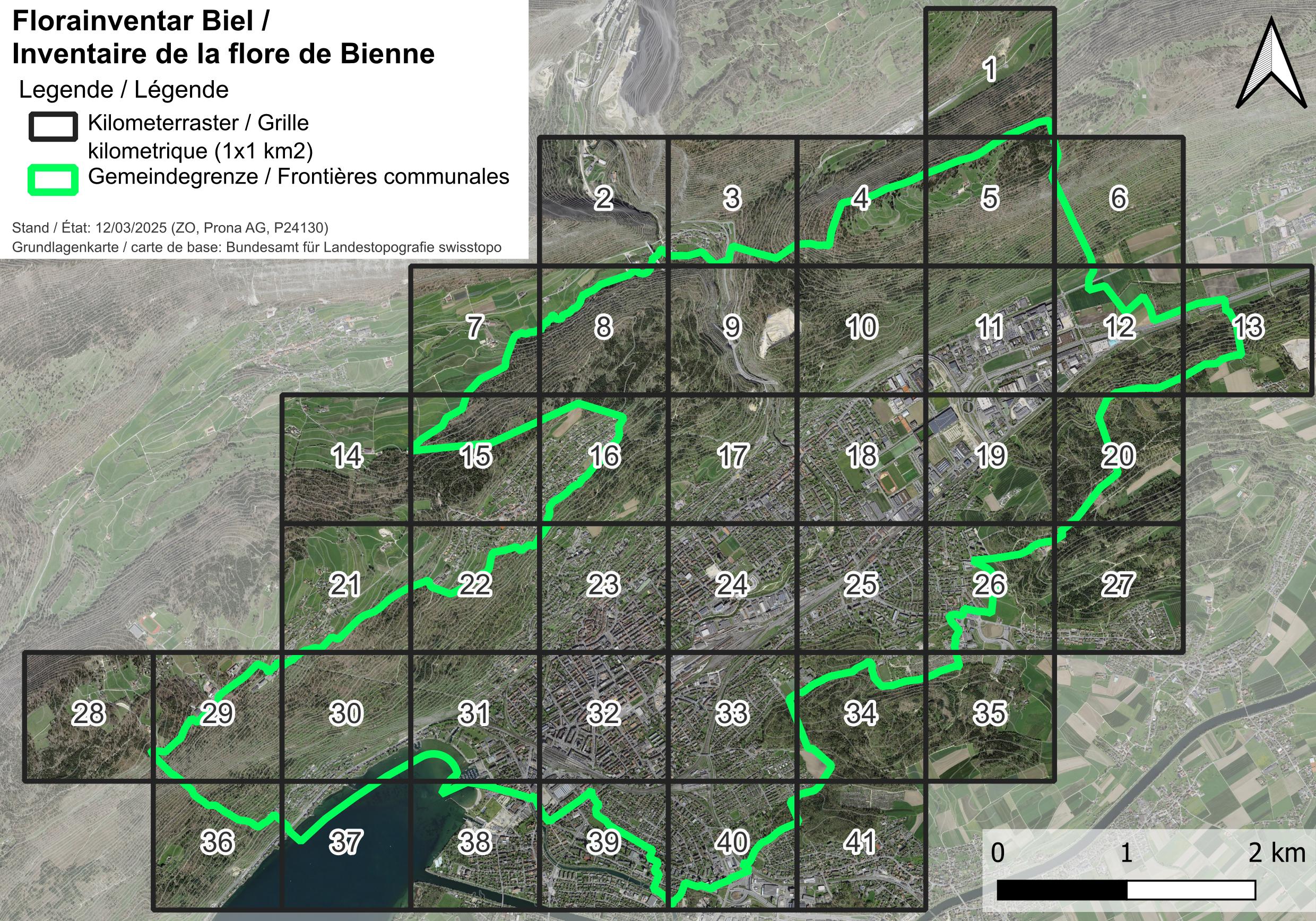 La ville de Bienne prévoit de dresser un inventaire des espèces végétales présentes sur son territoire entre 2024 et 2028. Prona AG apporte son soutien technique et organisationnel aux Biennoises et Biennois dans le cadre de ce recensement. L’objectif du projet est de mieux comprendre la biodiversité en milieu urbain, de la promouvoir de manière ciblée et de la préserver à long terme. Les cartographes bénévoles vont examinent la superficie de la ville kilomètre par kilomètre et enregistrent leurs découvertes floristiques dans l’application FlorApp. Prona AG n’a pas seulement élaboré les bases nécessaires à cet effet mais supervise et coordonne également la collecte des données, aide les cartographes pour les questions botaniques détaillées et garantit le contrôle de la qualité. À l’issue du projet, un rapport sera mis à la disposition des habitants de la ville afin de leur fournir une base d’informations transparente et un point de départ pour d’autres mesures écologiques.