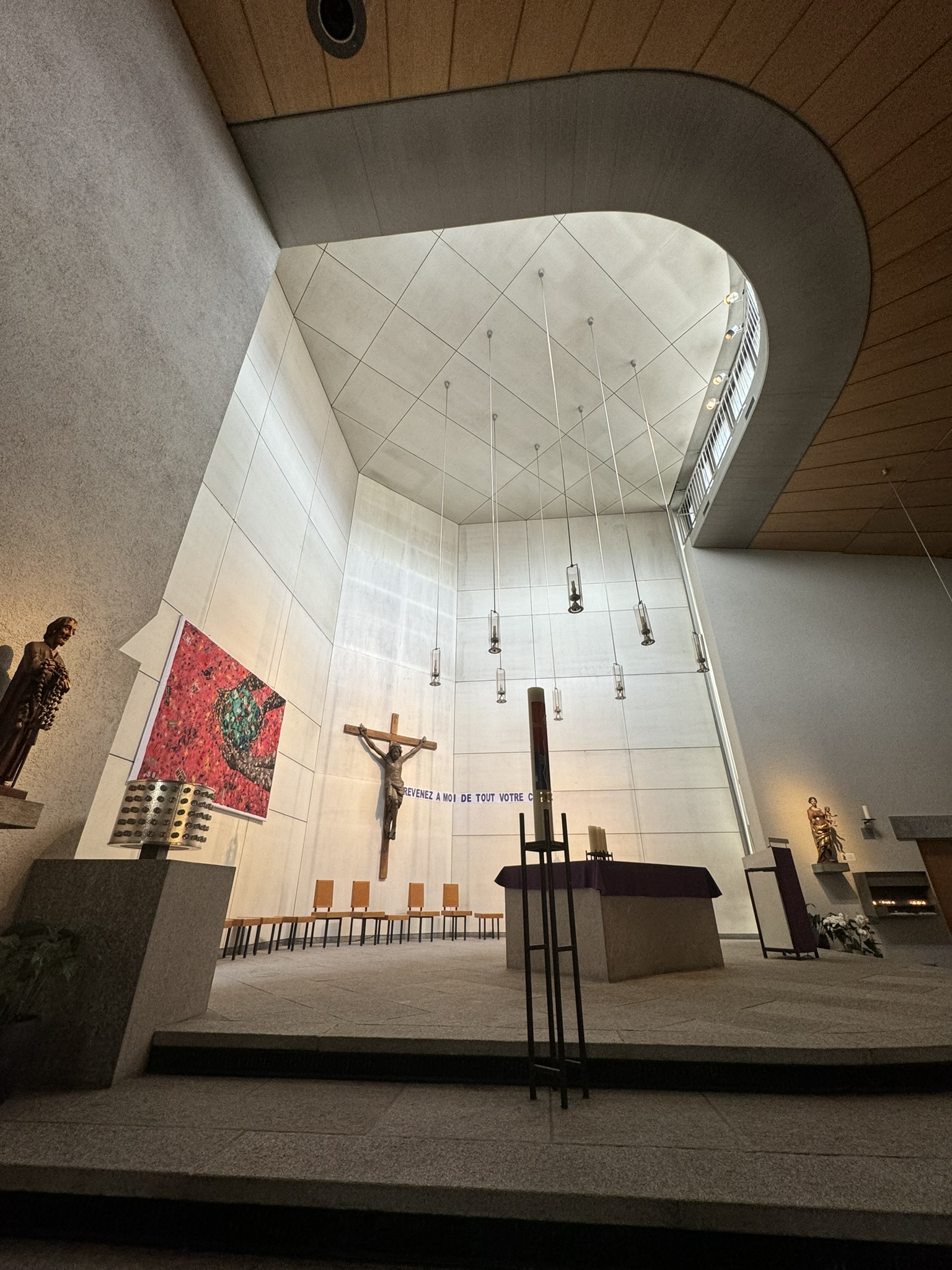 Erbaut wurde die Kirche in der zweiten Hälfte der 50er Jahre von Hermann Baur und ist als schützenswert eingestuft (K-Objekt). Charakteristisch für das Gebäude ist die nordseitige Eingangsfront, welche vollständig aus Betonsprossen mit Buntglasfenstern besteht. Der Lichteinfall erfolgt einerseits über die Nordfassade sowie die Dachfenster oberhalb des Chores. Zudem hat die Kirche keinen klassischen Turm, stattdessen befinden sich die Glocken an einem offenen Betongerüst. Westseitig der Kirche befindet sich ein dreigeschossiger Anbau mit den Nebenräumen, welche u.a. als Büros genutzt werden.
