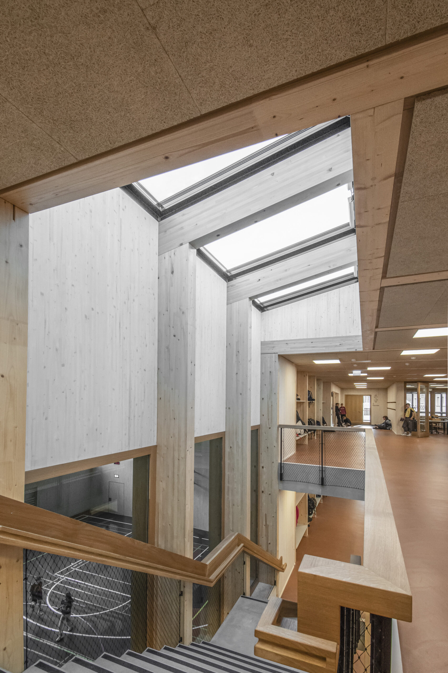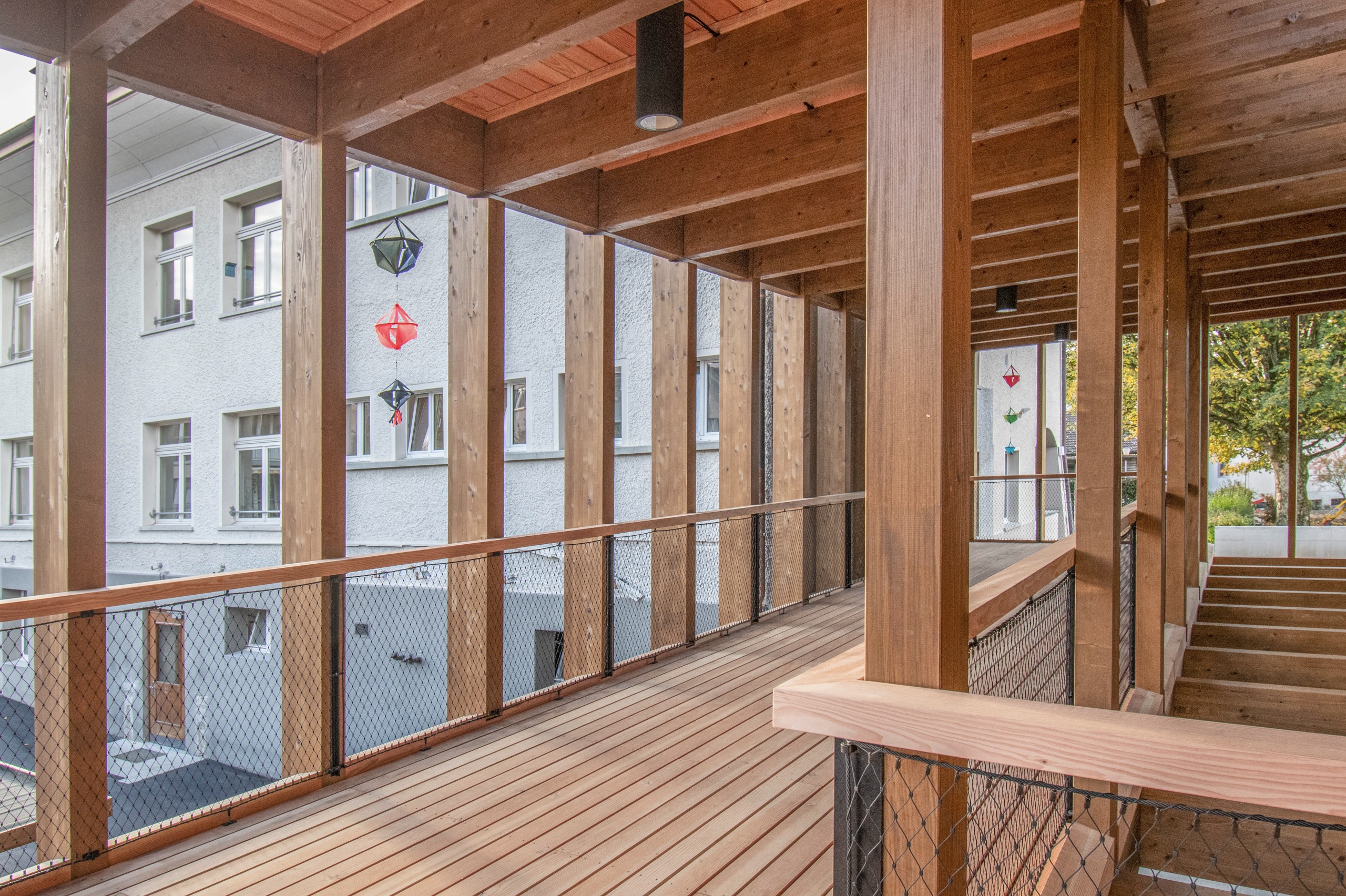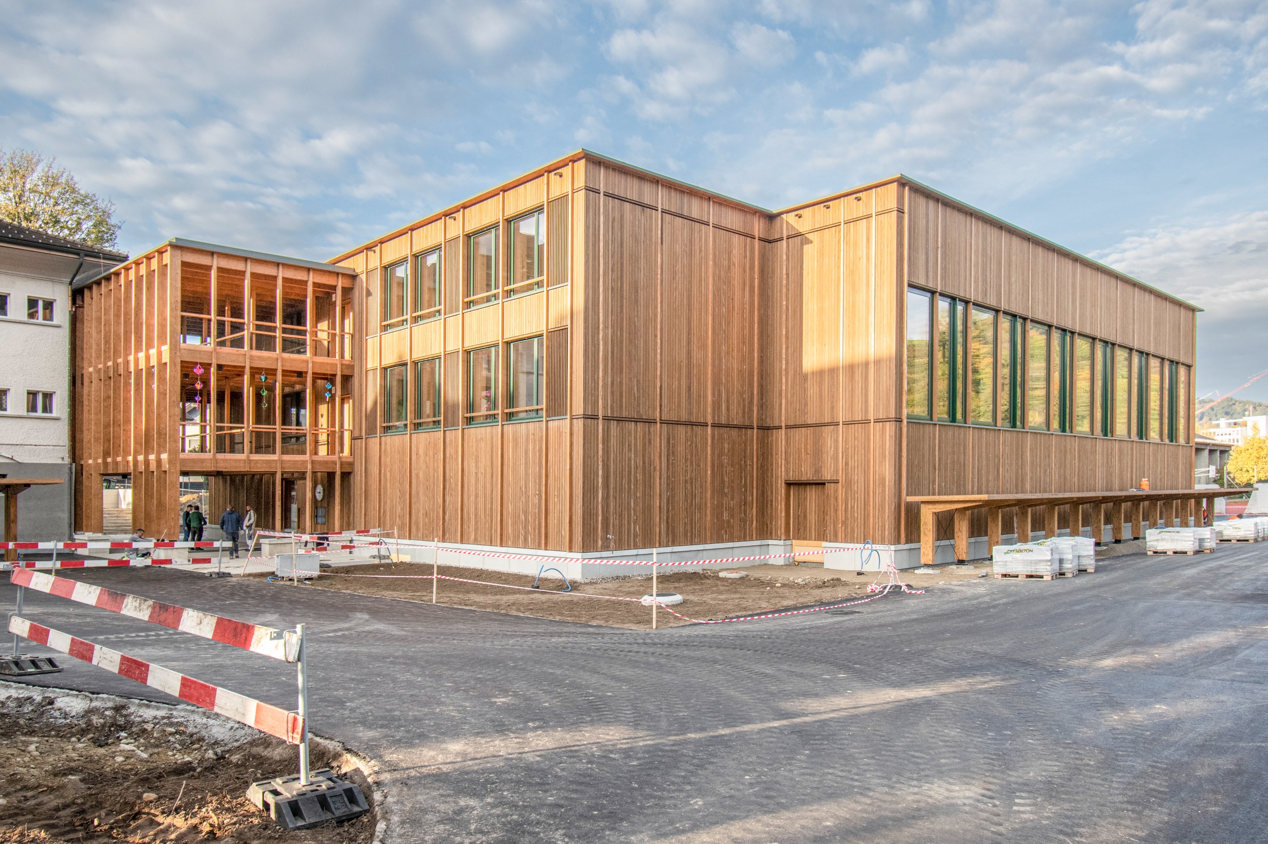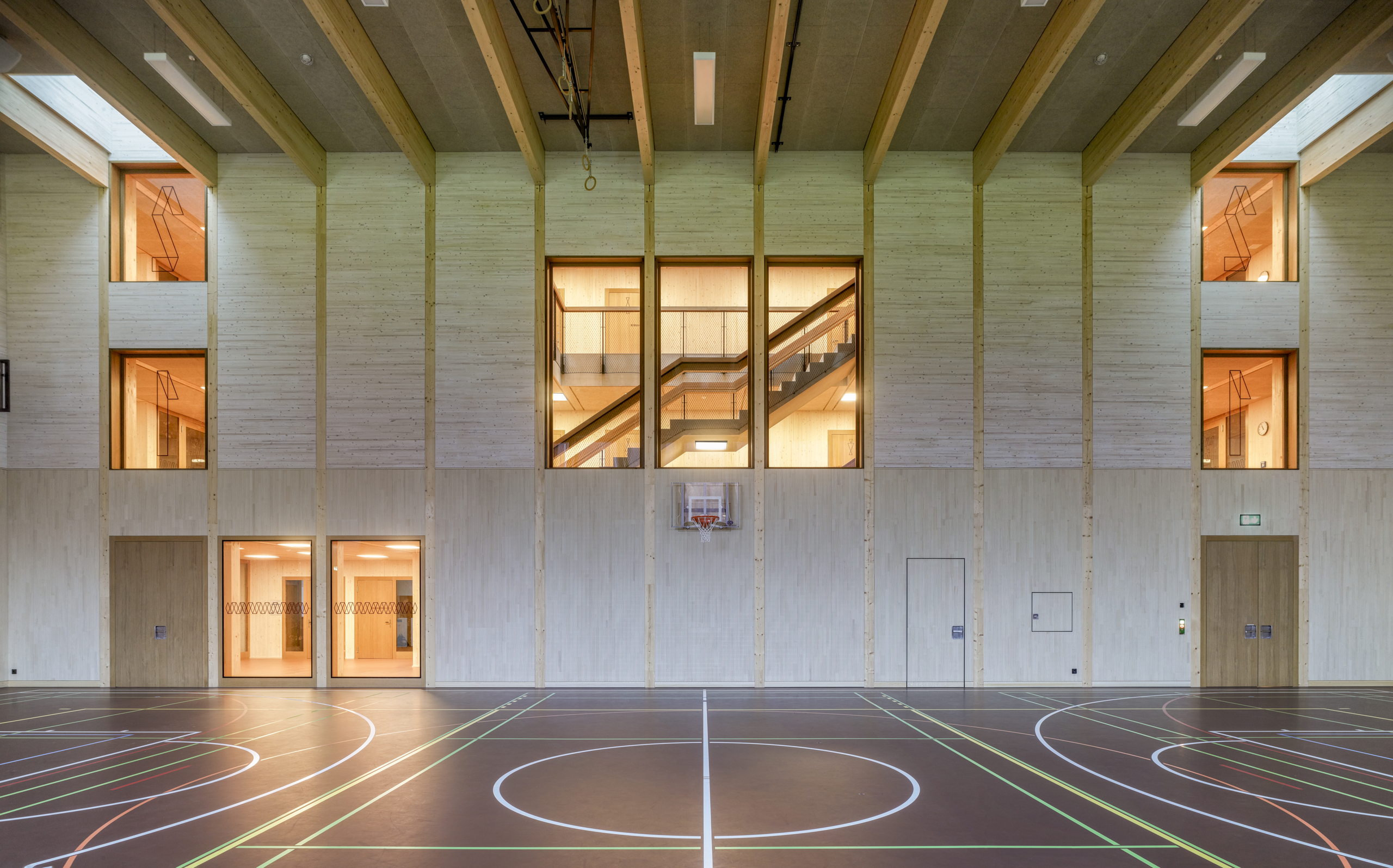 Bei dem Bau wurde grossen Wert auf die lokale Herkunft des Holzes gelegt, sodass das Label Schweizer Holz erreicht wurde. Zusammen mit der Grundwasserwärmepumpe und der grossen PV-Anlage kann der Neubau mithilfe von nachhaltigen Ressourcen beheizt werden. Dank klug gewählten Materialien und sinnvollen Akustikmassnahmen wurden behagliche Räume geschaffen, welche das Bestandsgebäude optimal ergänzen.